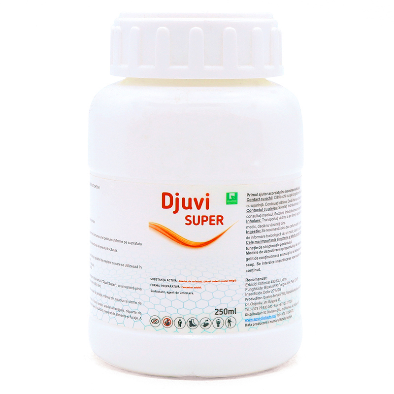 METODA DE APLICARE: Adăugăm adjuvantul "Djuvi Super" la soluția de erbicide, fungicide sau insecticide, apoi se amestecă bine până când se obține o soluție omogenă. Tratamentul trebuie efectuat în ziua preparării soluției, în condiții meteorologice uscate și fără vânt.