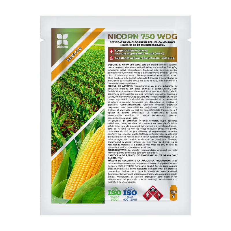 Nicorn 750 WDG este un erbicid sistemic, selectiv, post-emergent, din clasa sulfonilureice, ce conține 750 g/kg substanță activă nicosulfuron. Produsul este destinat pentru combaterea buruienilor mono și dicotiledonate, anuale și perene din culturile de porumb. Eficiența maxima este atinsă atunci cînd produsul este aplicat în faza de 2-8 frunze a porumbului, pe buruienile cu creștere activă de până la 15-20 cm înălțime, și o umeditatea corespunzătoare.