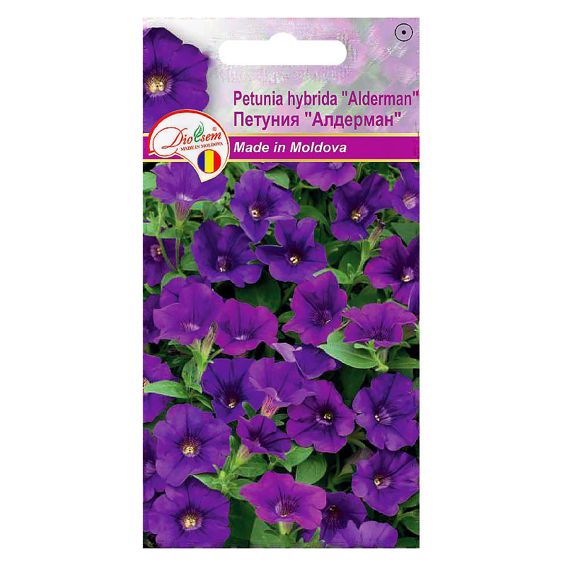 Petunia Alderman - plantă anuală. Tulpinile sunt rămuroase, cu înălțimea de 25-40cm. Flori cu aromă plăcută, cu diametrul de 5 cm, de forma unei pâlnii, de culoare albastru închis. Înflorește abundent din iunie până dau înghețurile. Se folosețte la decorarea floristică a balcoanelor.