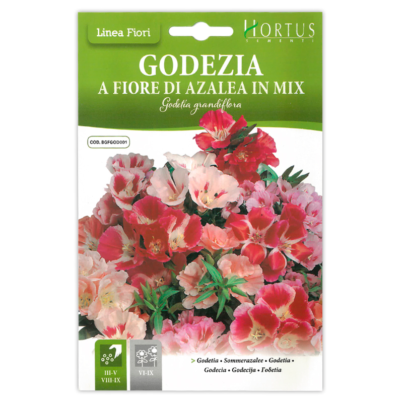 Godezia Fiore Azalea - este o plantă anuală elegantă, apreciată pentru florile sale delicate, care seamănă cu cele ale azaleei. Aceasta atinge o înălțime de aproximativ 30-50 cm și înflorește abundent din iunie până în septembrie. Florile sale mari, în nuanțe de roz, roșu, alb și violet, au un aspect mătăsos și atrag polenizatorii. Preferă locurile însorite, solurile bine drenate și udarea moderată. Este ideală pentru straturi florale, borduri și ghivece, aducând o notă de rafinament în grădină.