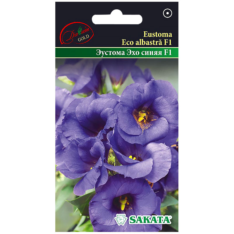 Eustoma "Eco albastră F1" - plantă anuală splendidă din familia Gentianaceae. Tulpinile cu înălțimea de până la 70 cm, puternice, durabile, capabile să mențină florile mari, dense, bătute. Având flori destul de mari (5-6 cm), de culoare albastru închis, florile la momentul înfloririi seamănă cu trandafiri pe jumătate deschiși, cu petale de satin, aranjate în spirală. Preferă locurile însorite, solurile cultivate, stropire și pulverizare regulată. Pentru obținerea plantelor cu flori în iulie - august, semănatul se efectuează la sfârșitul lunii februarie - începutul lunii martie. Semințele sunt mici, nu se acoperă, rămănând pe suprafața substratului, se hidratează cu pulverizatorul și se acoperă cu sticlă. Răsaduri apar în 10-15 zile la o temperatură de +20-21C. Necesită lumină. Răsadurile se replantează când floarea are deja 2-3 frunze în ghiveciuri aparte. În câmp se plantează atunci când pericolul de îngheț a trecut. Se folosește pentru a decora mixuri de flori, rondouri, borduri și la tăiere.