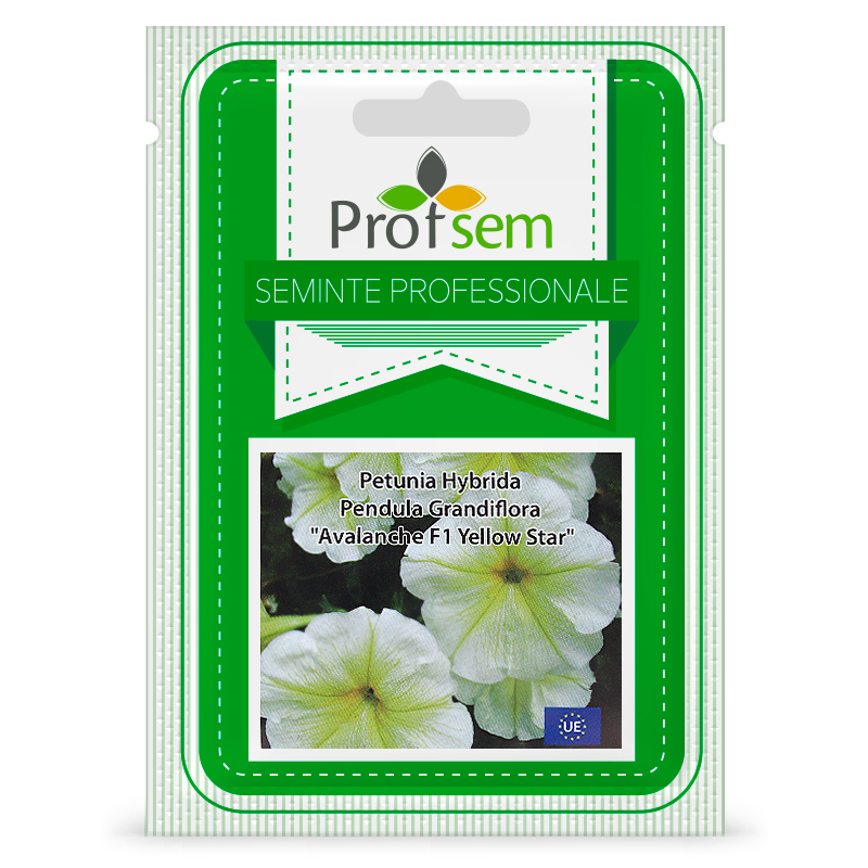 "Avalanche F1 Yellow Star F1" - grup de petunii hibride ampeloase. Plantele tinere cresc vertical. În procesul de creștere, lăstarii atârnă în jos și formează o adevărată avalanșă de flori mari în nuanțe luminoase sau pastelate. Foarte eficient în cutii de balcon, coșuri suspendate etc. Flori cu o nervură galbenă închisă distinctă, de 7-9cm în diametru, divergente de la faringe, asemănătoare stelelor.