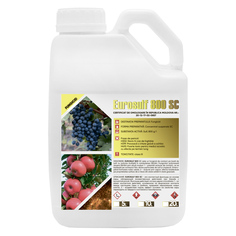 EUROSULF 800 SC este un fungicid de contact pe bază de sulf, cu acțiune multiplă în combaterea făinării. Fungicidul acţionează asupra făinării prin două moduri: 1 - prezintă acțiune de contact, ce se bazează pe contactul fizic dintre particulele de sulf şi ciupercă, între- rupând formarea noilor celule; 2 - acțiune prin vapori, efectul bazânduse pe proprietatea sulfului de a trece din stare solidă în stare gazoasă.
