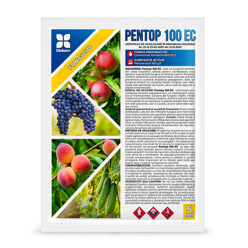 Pentop 100 EC este un fungicid sistemic din grupa triazolilor, utilizat pentru combaterea unui spectru larg de boli fungice la pomi fructiferi, viță de vie, legume și plante ornamentale. Substanța activă penconazol are acțiune preventivă și curativă, asigurând protecție eficientă împotriva agenților patogeni.