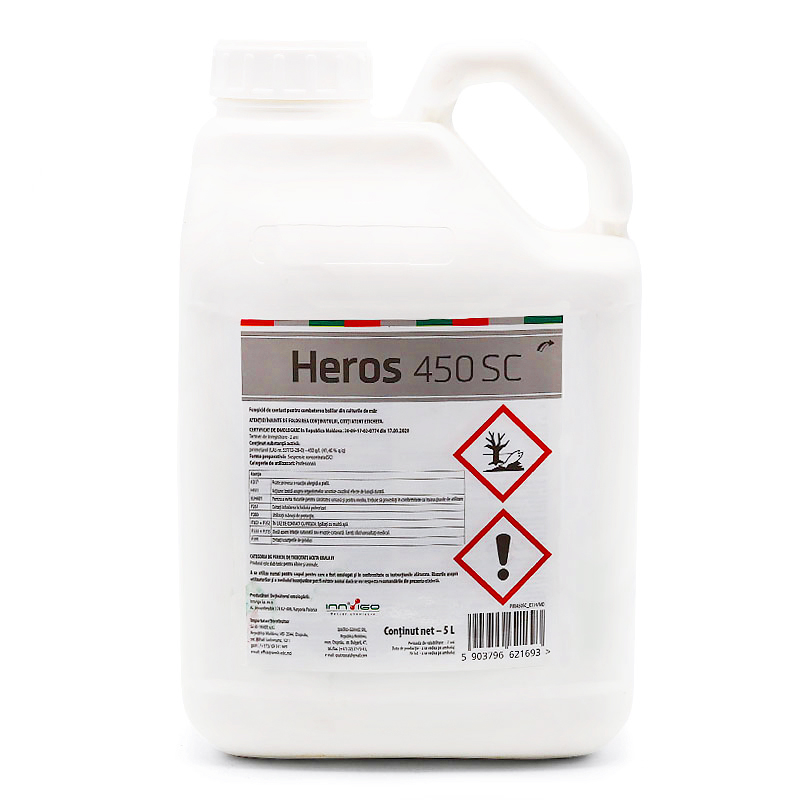 Proprietăţi fizico-chimice: Heros 450 SC se prezintă sub formă de lichid limpede, omogen. de culoare galbenă, cu miros caracteristic.