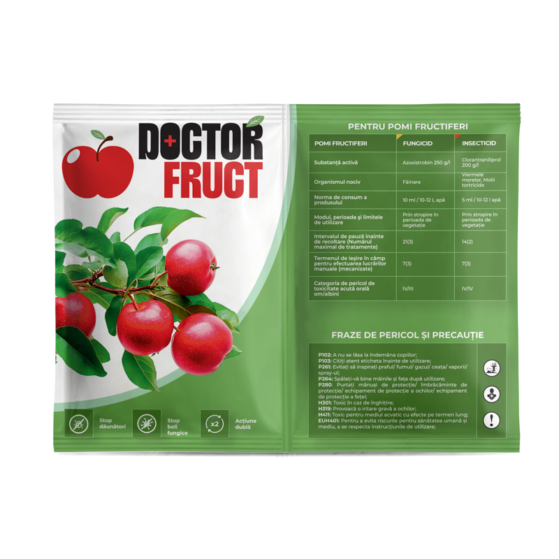 Doctor Fruct este o combinație eficientă dintre un fungicid modern pe bază de azoxistrobin și un insecticid de ultimă generație pe bază de clorantraniliprol, destinată protecției complete a pomilor fructiferi împotriva bolilor și dăunătorilor. Produsul oferă acțiune preventivă, curativă și de combatere directă a insectelor, contribuind la obținerea unor fructe sănătoase și de calitate superioară.