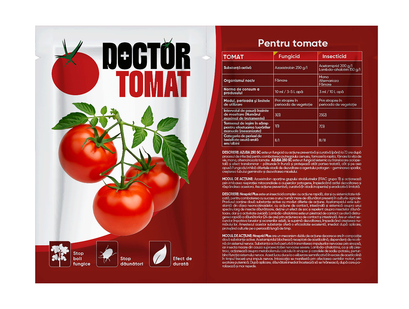 Insecto-fungicidul Doctor Tomat – protecție completă pentru tomate este un amestec profesional de fungicid și insecticid, special creat pentru cultura de tomate, care permite combaterea simultană a bolilor și dăunătorilor.