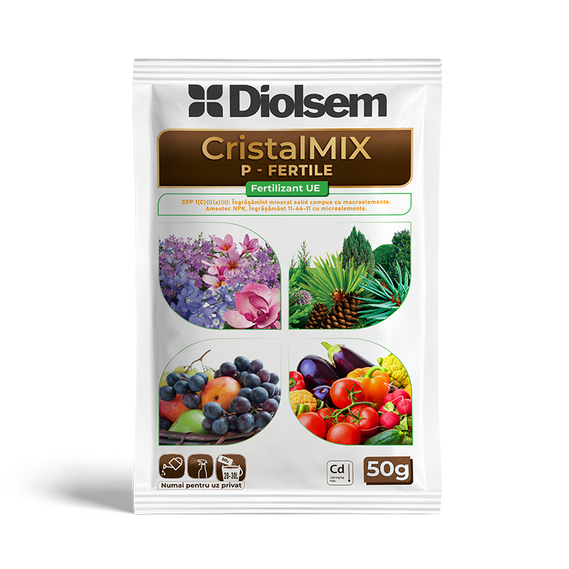 Diolsem CristalMix P–Fertile este un îngrășământ cristalin, ușor solubil în apă, conceput special pentru a stimula dezvoltarea optimă a rădăcinilor. Formula sa îmbogățită cu fosfor și o gamă completă de oligoelemente chelatate îl face ideal pentru fertilizarea atât foliară, cât și radiculară. Potrivit pentru toate culturile, acest fertilizant previne deficiențele de fosfor și alți nutrienți esențiali, asigurând plantelor o creștere sănătoasă și viguroasă