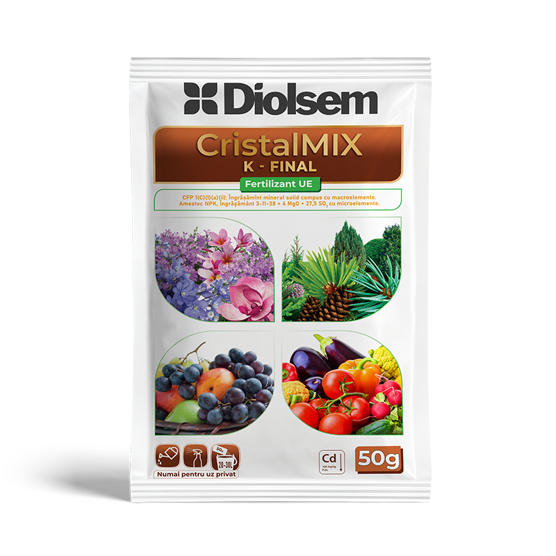 Diolsem CristalMix K–Final este recomandat pentru utilizare din primă - vară până în toamnă. Pentru aplicarea corectă, se dizolvă 1 kg de fertilizant într-un volum de 100 litri de apă și se aplică la sol prin udare la rădăcină în jurul plantelor, de asemenea, fertilizantul poate fi aplicat și prin stropire foliară, utilizând aceeași soluție. Dozele exacte pot varia în funcție de tipul de sol, stadiul de dezvoltare al plantelor și condițiile climatice. Pentru a preveni arsurile solare, evitați aplicarea îngrășământului pe frunzele plantelor în timpul zilei, când soarele este puternic. Asigurați o udare regulată pentru a susține creșterea optimă și o înflorire abundentă a plantelor. A se utiliza exclusiv în caz de necesitate recunoscută. A nu se depăși doza de aplicare.