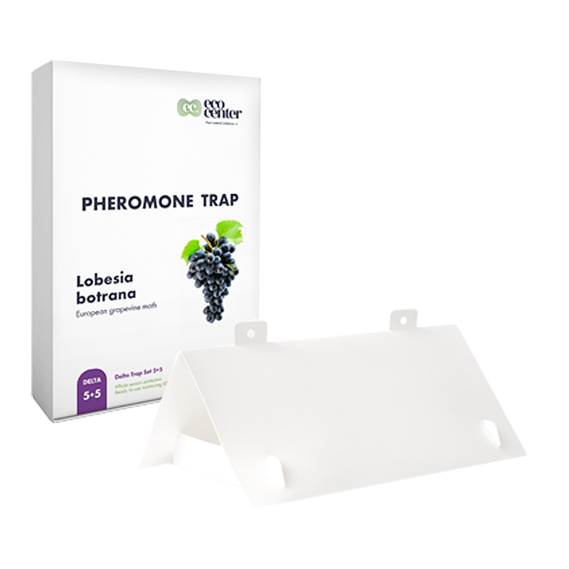 Acest kit include o capcană din plastic tip Delta, un insert adeziv, agățători metalice și o momeală feromonală Lobesia botrana.