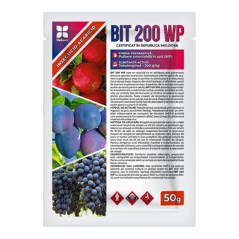 Bit 200 WP este un insecto-acaricid care se administrează prin aplicare foliară la apariția dăunătorilor sau profilactic. Produsul oferă un control sigur al diferitelor specii de acarieni fitofagi, inclusiv păianjenul roșu al pomilor. Combate dăunătorii țintă în toate fazele ciclului lor biologic, de la ou (cu excepția ouălor de iarnă) până la adulți. Datorită proprietăților sale translaminare locale, produsul pătrunde în frunze și se menține o perioadă îndelungată, asigurând un control total al dăunătorilor pe ambele părți ale frunzei.