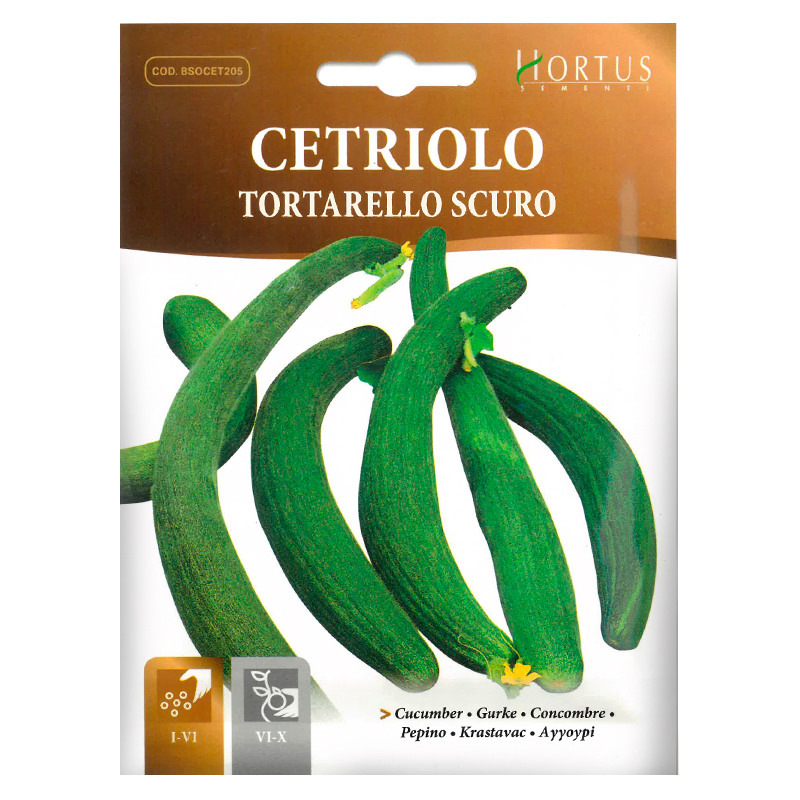 Castravetele Tortarello Verde Scuro - este un soi italian apreciat pentru fructele sale lungi, de culoare verde închis, care ating aproximativ 25-30 cm în lungime. Aceste castraveți au o textură crocantă și o aromă intensă, fiind ideali pentru consumul în stare proaspătă, dar și pentru conserve. Planta este viguroasă și se dezvoltă cel mai bine în soluri fertile, bine drenate, expuse la soare direct. Soiul preferă condiții climatice calde și este rezistent la diverse boli ale plantelor, ceea ce îl face ușor de cultivat. Recoltarea se face atunci când fructele sunt de dimensiuni potrivite, înainte ca acestea să devină prea mature, pentru a păstra gustul și textura optimă.