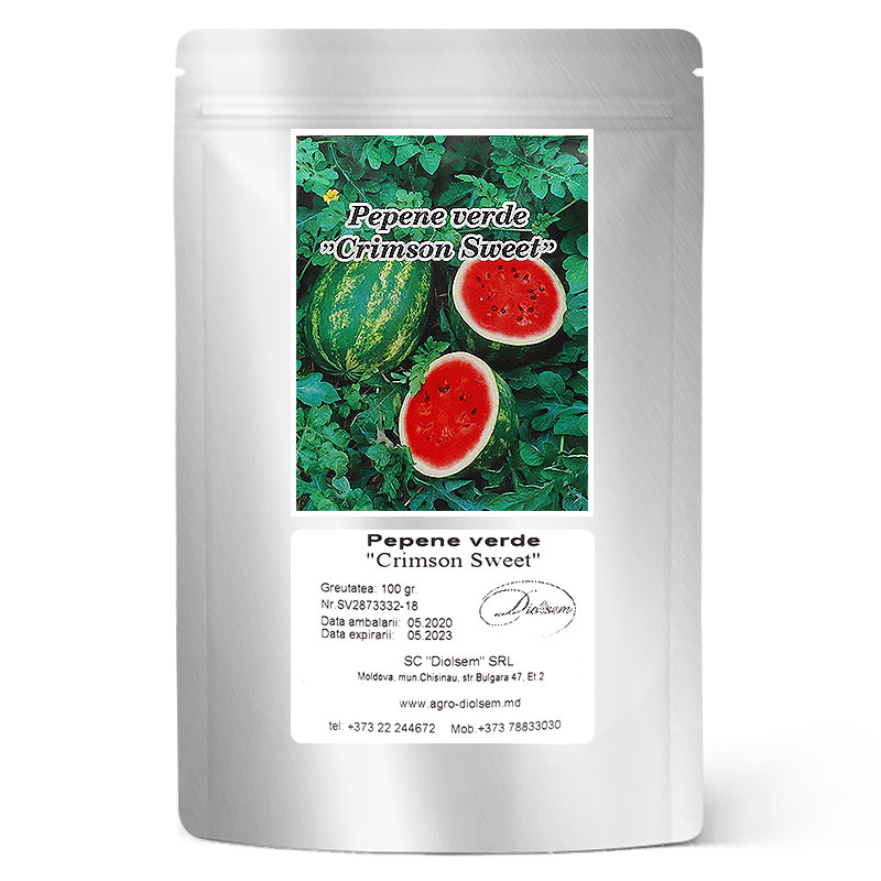 Pepene verde "Crimson Sweet" - mediu timpuriu (85 de zile), una dintre cele mai bune soiuri pentru sere și teren deschis. Fructele sunt mari (8-12 kg), dungate, foarte dulci, cu coaja subțire. Carnea este roșu aprins, crocantă.