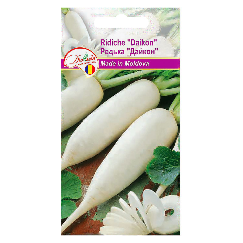 Ridiche ''Daikon'' - soi semitimpuriu. Perioada de vegetaţie de la răsărire până la maturitate tehnică 60-75 zile. Rădăcina este de formă cilindrică, netedă, de culoare albă, cu lungimea de 40-60cm, având diametrul de 7-10cm, cu greutate de 400-600g. Pulpa este crocantă, suculentă şi albă, dulce, cu o aromă proaspătă. Soiul este rezistent la frig, semănăturile răsărite suportă îngheţuri de pînă la -3°С.