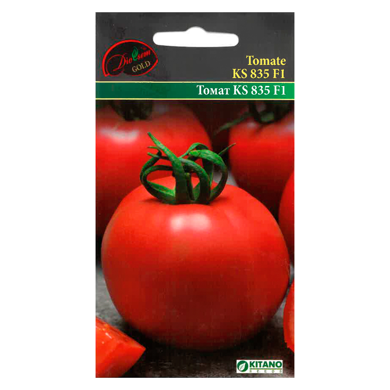 Tomate "KS 835 F1" - Hibridul de roșii semitarziv este o plantă compactă, cu un aparat de frunze bine dezvoltat, care oferă protecție fructelor împotriva arsurilor. În plus, sistemul său puternic de rădăcină asigură nutriția plantei în condiții nefavorabile. Fructele acestei plante sunt rotunde, mari, carnoase, gustoase și zaharoase, cu o greutate medie cuprinsă între 220 și 270 g și cu o culoare interioară și exterioară roșu strălucitor bogat. Structura internă a fructelor este omogenă, fără prezența de zone albe în interior și fără o pată verde pe tulpină. De asemenea, roșiile sunt ușor transportabile și nu își pierd calitățile comerciale și gustative, fiind potrivite pentru depozitare pe termen lung. Această varietate de roșii este rezistentă la nematodo, berticiple și fusarium și poate fi cultivată cu succes atât la temperaturi ridicate, cât și la temperaturi scăzute.