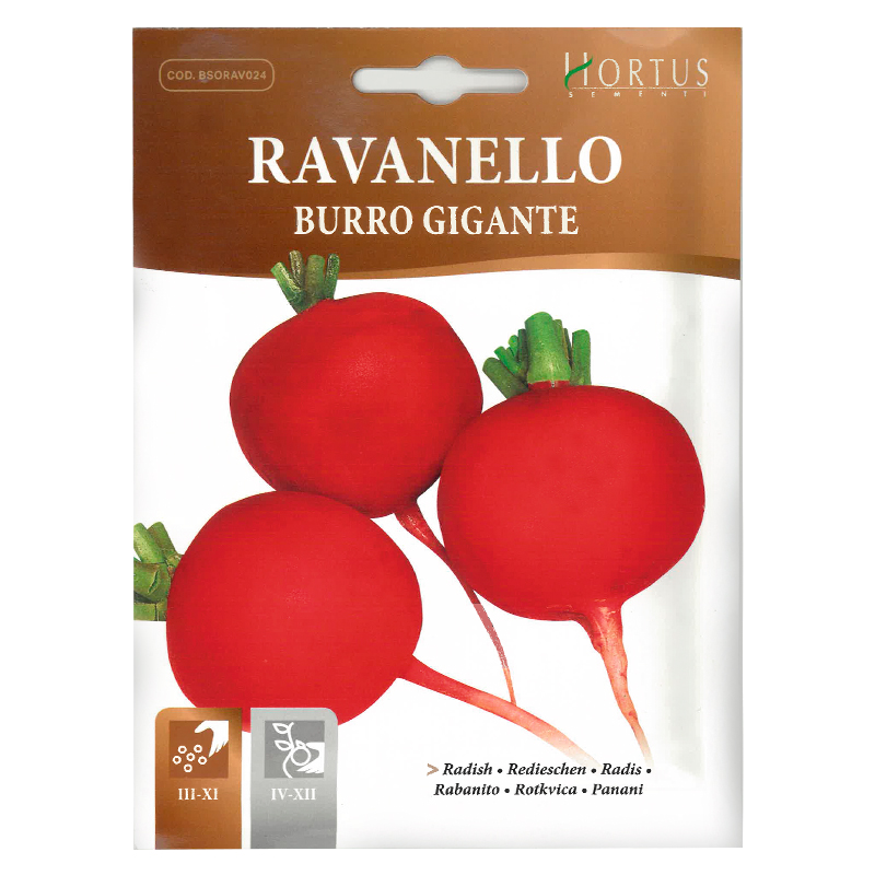 Ridichea Burro Gigante - este o varietate de ridiche cu dimensiuni mari și o formă rotundă, având o coajă de culoare albă, lucioasă. Acesta este apreciată pentru textura sa cremoasă și gustul său delicat, care adaugă o notă ușor dulce și ușor picantă în diverse preparate. Ridichea Burro Gigante crește rapid și poate ajunge la dimensiuni impresionante, fiind o alegere excelentă pentru grădinile de legume.