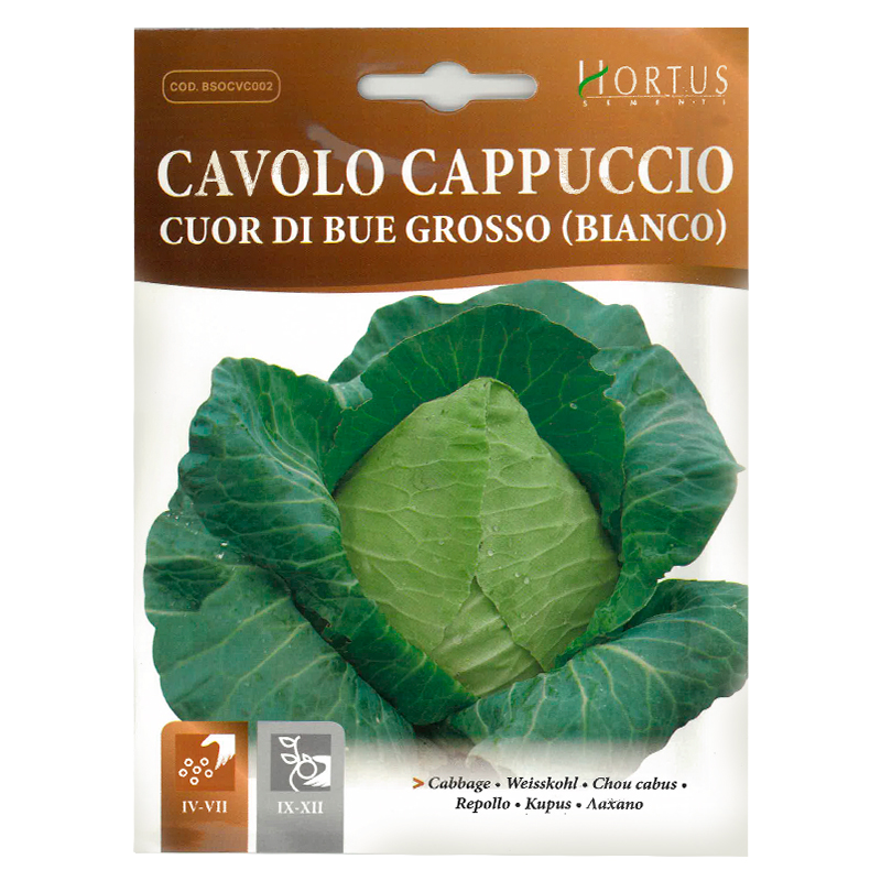 Varza Cuor di Bue Grosso - este un soi tradițional, cunoscut pentru forma sa distinctivă, alungită, asemănătoare unei inimi de bou. Această varietate produce căpățâni mari, compacte, cu frunze netede, de un verde deschis, având un gust dulce și o textură fragedă. Este ideală atât pentru consumul în stare proaspătă, cât și pentru gătit, fiind utilizată în salate, supe sau preparate la abur.