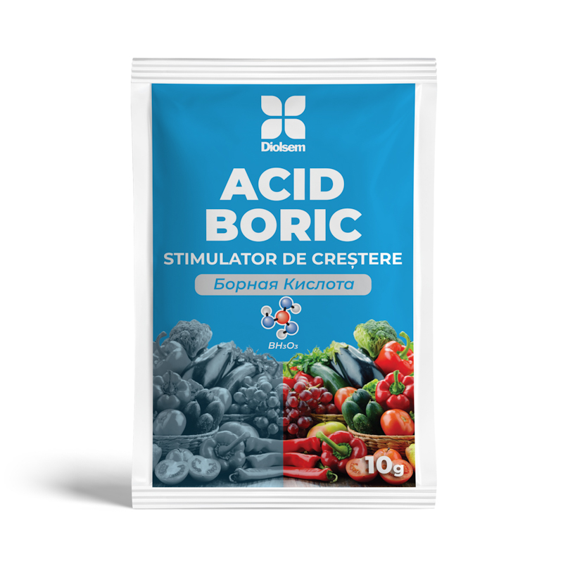 ACIDUL BORIC este utilizat ca preparat antiseptic de uz extern, pentru spălarea rănilor. Borul contribuie la creşterea clorofilei, îmbunătăţeşte recolta, rezistenţa la boli şi la efectele negative ale mediului. Borul este necesar pentru a creşte nivelul de calciu in plante, precum şi pentru dezvoltarea şi restaurarea sistemului radicular, zahăr şi caroten în plute, îmbunătăţeşte intensitatea înfloririi culturilor de flori.Acidul boric ca insecticid de grădină este folosit mai des ca preparat de contact împotriva gândacilor şi furnicilor, dar are şi un efect intestinal. Momeala uscata cu acid bone acţionează ca otrăvuri intestinale de contact contra dăunătorilor. Acţiunea combinată se manifesta treptat, pe măsură ce se acumulează în organismul insectelor