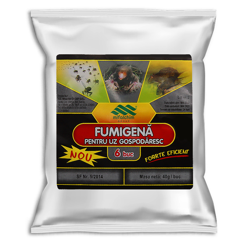FUMIGENĂ - tub de forma cilindrică învelit într-un strat de sulf topit care, prin aprindere, generează un fum înecăcios, bogat în dioxid de sulf. Acesta are rolul de a reduce concentrația de oxigen din încăpere, obligând astfel rozătoarele să migreze în altă parte. În plus, fumul produs de acest tub ajută și la îndepărtarea muștelor de oțet și a altor insecte din spațiile de depozitare a legumelor, fructelor și cerealelor.