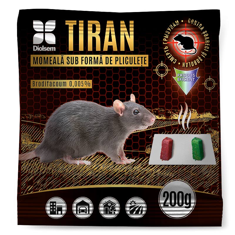 DESCRIERE: Tiran pliculete este o momeală otrăvitoare concepută pentru a distruge sobolani gri şi negri şi şoarecii de casă in locuinte şi alte spaţii: depozite, subsoluri, anexe etc., în conditiile de zi cu zi. Proprietățile rodenticide se datorează substanţei brodifacum -anticoagulant de a doua generație, care modifica starea funcţională şi provoaca hemoragii in organele interne şi de coagulare a sângelui. Moartea rozatoarelor are loc la 5-11 zi după ce mănâncă momeala.
