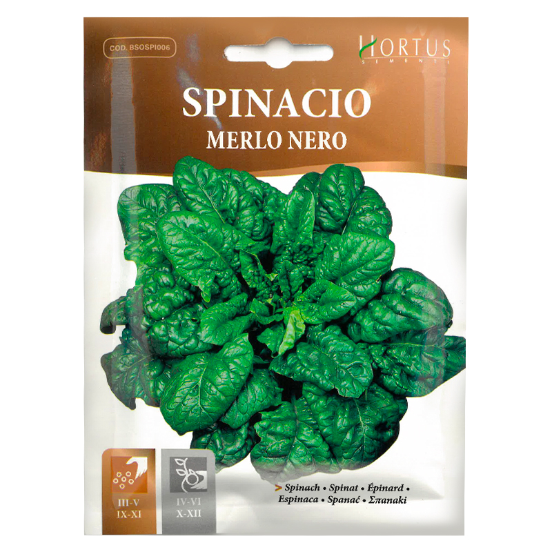 Spanacul Merlo Nero - este o varietate de spanac cu frunze mari, de un verde închis intens, caracterizată printr-o textură catifelată și un gust delicat. Acest soi este apreciat pentru creșterea rapidă și productivitatea ridicată, fiind ideal atât pentru consum proaspăt, cât și pentru preparate gătite. Se adaptează bine la diferite condiții climatice și poate fi cultivat pe tot parcursul anului, deși preferă temperaturi moderate și sol bine drenat, bogat în substanțe nutritive. Semănatul se poate face direct în grădină, la distanțe potrivite pentru o dezvoltare corespunzătoare a plantelor. Udarea regulată este esențială pentru obținerea unor frunze fragede și suculente. Spanacul Merlo Nero este o alegere excelentă pentru salate, supe, piureuri sau diverse garnituri, datorită aromei sale plăcute și beneficiilor nutritive.