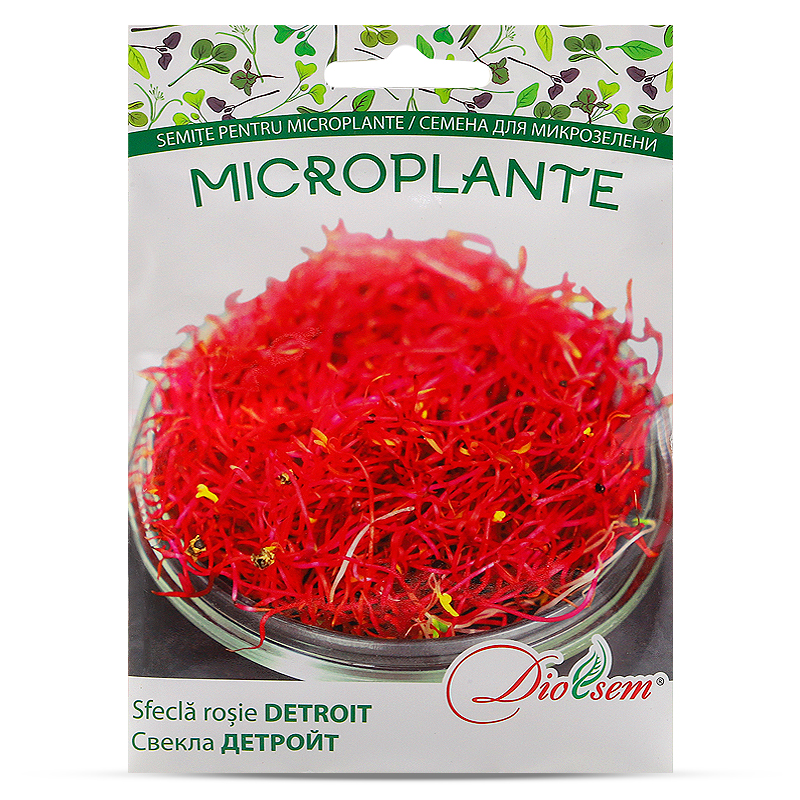 Microplante Sfeclă roșie Detroit - sunt frunze verzi fragede și o tulpină roz aprinsă. Gustul microplantelor seamănă cu un gust plăcut de sfeclă, datorită acestui fapt, se simte dulceața și prospețimea. Înălțimea plantei este de aproximativ 5-15 cm. Perioda de la însămânțarea semințelor până la colectarea microplantelor este de 5-12 zile.