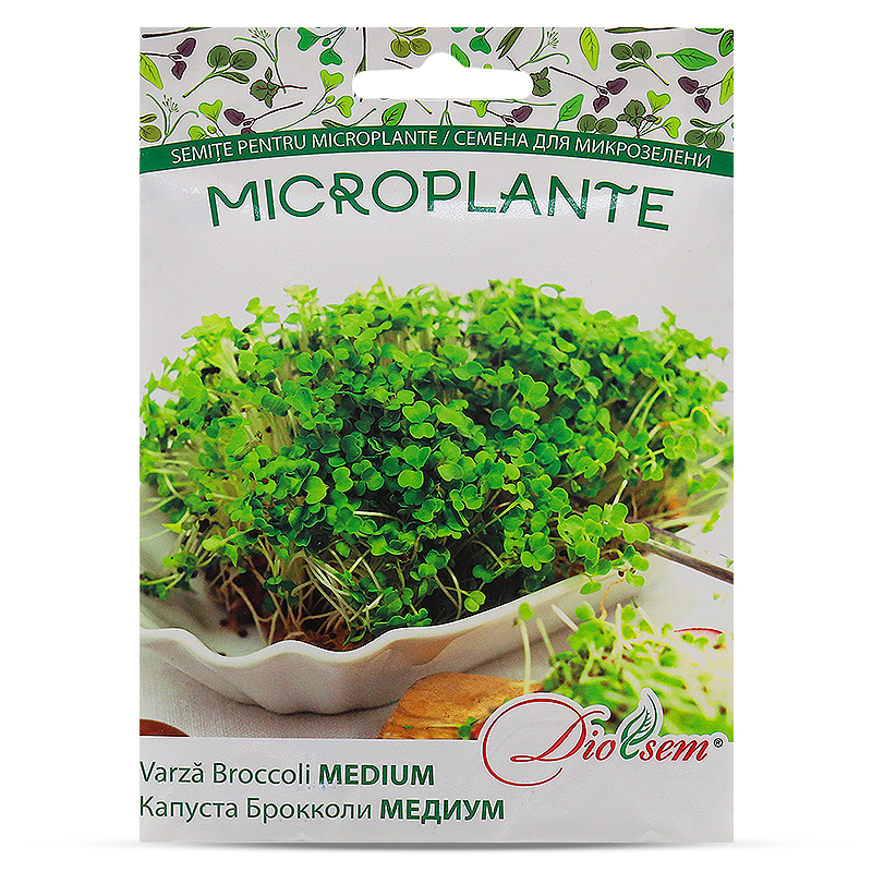 Microplante Varzâ Broccoli Medium - frunzele fragede vor diversifica și completa regimul alimentar, vor decora salatele, sandvișurile și alte mâncăruri. Frunzele ușor picante de broccoli conțin un complex de vitamine și oligoelemente care completează perfect alimentele, garantând un gust plăcut și multe beneficii pentru sănătate. Înălțimea lăstarilor ajunge până la 7-10 cm, iar perioada de germinare - 7-10 zile.