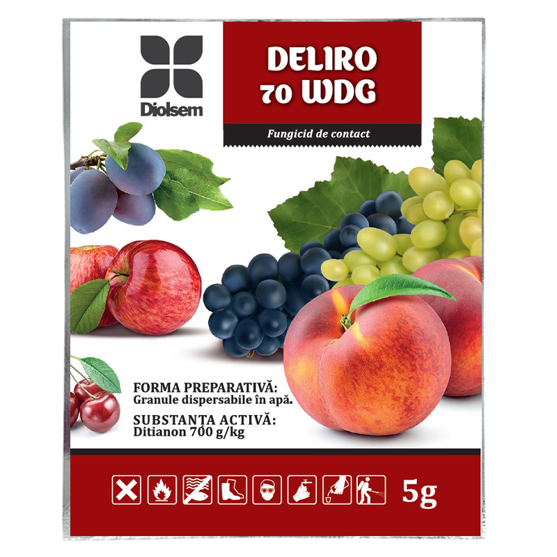 DELIRO 70 WDG - контактный фунгицид. Фунгицид активен против ложной мучнистой росы винограда, гнили семенных плодовых пород, фитофтороза персика, монилиоза и др. Deliro 70 WDG, нанесенный на растительность, образует осадок кристаллов, которые при определенных условиях мигрируют в газовую фазу, воздействуя на споры до тех пор, пока они не вступят в контакт с растением. Препарат Deliro 70 WDG обладает быстрым действием. Эффект борьбы сохраняется от 5 до 10 дней, в зависимости от климатических условий и вида вредителя.