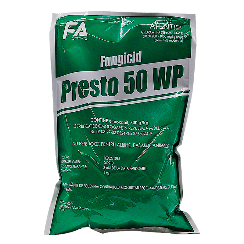 Способ действия: Presto 50 WP проникает в ткани листа и распространяется трансламинарно. Останавливает рост поражения и споруляцию, вызывая реакцию самозащиты растения.
