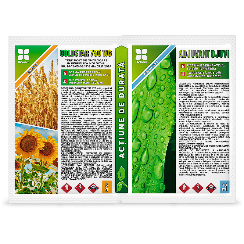 Goldstar 750 WG - это системный селективный гербицид из группы сульфонилмочевин, который применяется постемергентно для борьбы с однолетними и многолетними двудольными сорняками, а также с некоторыми однолетними злаковыми сорняками, находящимися на ранних стадиях развития, в культурах подсолнечника и пшеницы. Максимальная эффективность гербицида достигается, когда однолетние двудольные сорняки находятся на стадии 2-4 листьев, а многолетние - на стадии розетки. Применяется постемергентно, с 4 до 6 настоящих листьев культуры. Для максимальной эффективности рекомендуется применять в смеси с адъювантом Djuvi Super.