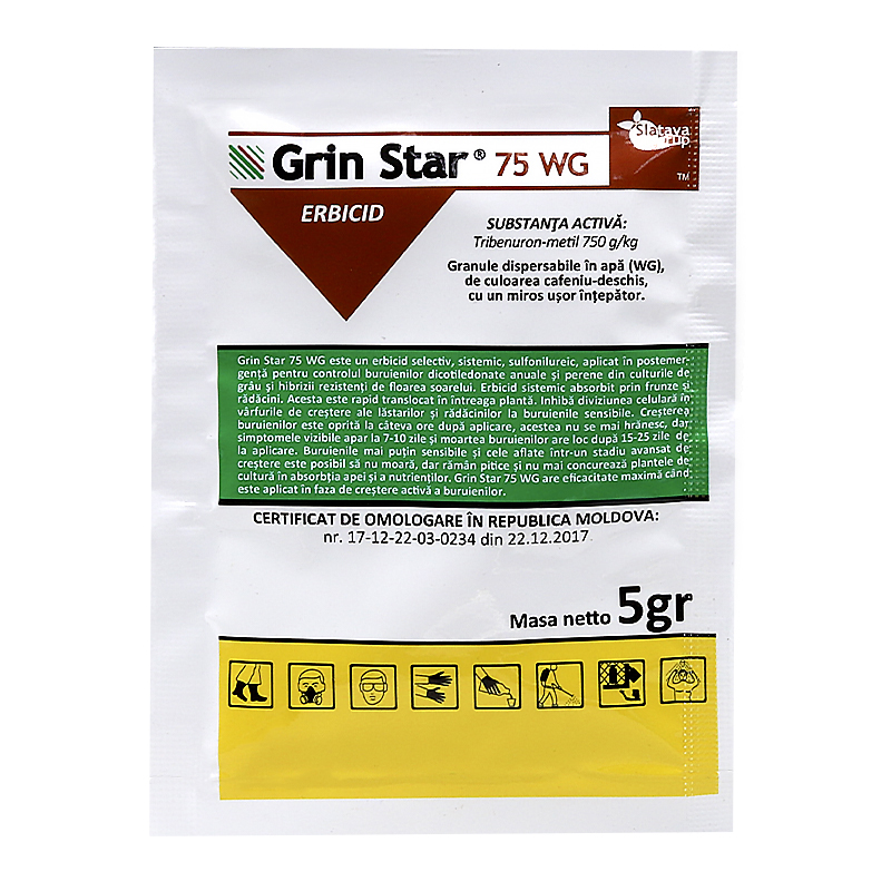 GRIN STAR 75 WG - селективный системный гербицид на основе сульфонилмочевины, применяемый после всходов для борьбы с однолетними и многолетними двудольными сорняками в посевах пшеницы и устойчивых гибридах подсолнечника. Системный гербицид всасывается через листья и корни. Он быстро распространяется по всему растению. Он подавляет деление клеток кончиков побегов и корней чувствительных сорняков. Рост сорняков прекращается через несколько часов после внесения, больше не питаются, но видимые симптомы появляются через 7-10 дней, а гибель сорняков наступает через 15-25 дней после внесения. Менее чувствительные сорняки и сорняки, находящиеся на продвинутой стадии роста, возможно, не погибнут, но они останутся карликовыми и больше не будут конкурировать с сельскохозяйственными растениями в поглощении воды и питательных веществ. Grin Star 75 WG имеет максимальную эффективность при применении в фазу активного роста сорняков.