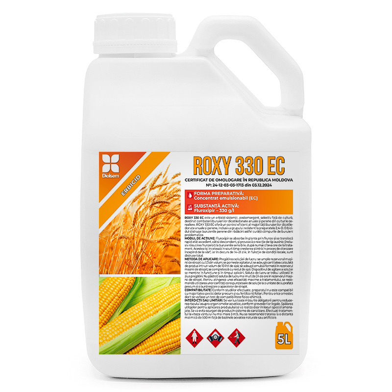 Roxy 330 EC — синтетический ауксиновый гербицид, постемерджентный и селективный, предназначенный для борьбы с однолетними и многолетними двудольными сорняками в культурах пшеницы и кукурузы. Roxy 330 EC эффективно контролирует большинство двудольных сорняков, включая группу, устойчивую к препаратам 2,4-Д. Оптимальная температура для применения гербицида составляет от 8 до 25°C. В этих условиях растения развиваются нормально, активное вещество всасывается через листья и транспортируется в точки роста сорняков. Он быстро разлагается в почве и не представляет угрозы фитотоксичности для культур, которые будут посажены в рамках севооборота.