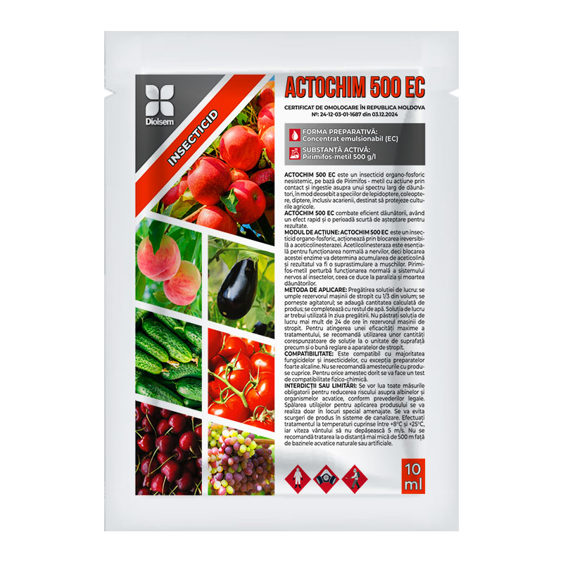 АКТОХИМ 500 EC – это несистемный фосфорорганический инсектицид на основе пиримифос-метила, действующий контактным и кишечным способом против широкого спектра вредителей, особенно видов из отрядов чешуекрылых (Lepidoptera), жесткокрылых (Coleoptera), двукрылых (Diptera), а также клещей. Он предназначен для защиты сельскохозяйственных культур, эффективно борется с вредителями, обеспечивает быстрое действие и короткий период ожидания для получения результата.