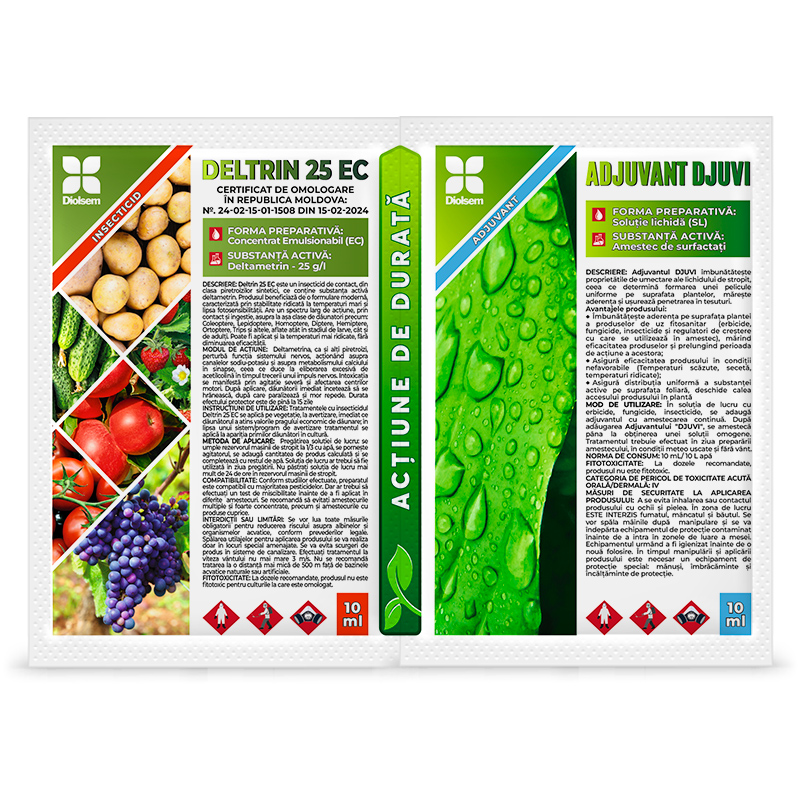 Дельта 25 EC – это контактный инсектицид из класса синтетических пиретроидов, содержащий действующее вещество дельтаметрин. Продукт обладает современной формулой, характеризующейся высокой стабильностью при высоких температурах и отсутствием фоточувствительности. Имеет широкий спектр действия, при контакте и при поглощении, на такие классы вредителей, как: жесткокрылые (Coleoptera), чешуекрылые (Lepidoptera), равнокрылые (Homoptera), двукрылые (Diptera), полужесткокрылые (Hemiptera), прямокрылые (Orthoptera), трипсы (Thysanoptera) и другие, находящиеся как в стадии личинок, так и взрослых особей. Может применяться при повышенных температурах без снижения эффективности.